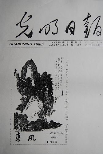 1988年8月21日,《光明日报》在《周抡园山水画展》期间刊登先生作品《一览天下小》。