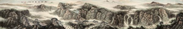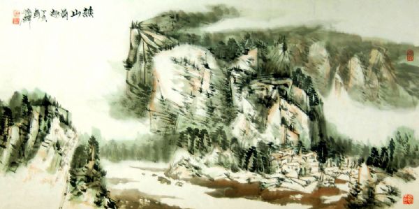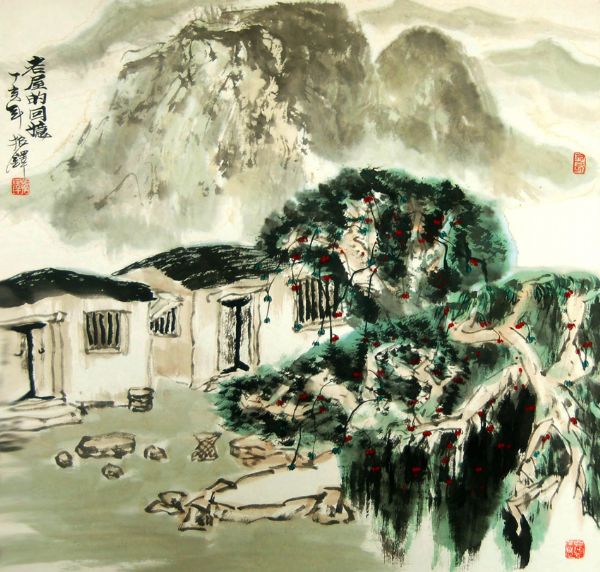 程振铎的山水,烟云蒸腾,山川秀美,实中有虚,虚中有实。局部以染代皴,结构章法也很讲究。他吸收了北宋范宽、南宋李唐,元代王蒙的一些山水画学养,对明代的董其昌也颇有研究。他善用积墨,层层追加,画中的积墨比较丰富。多用中锋勾勒出山石的外轮廓及轮廓内的道道纹路,以“苍润”之笔墨、“游离”之锋毫从峰峦边缘向下刮,取其劲锐之气及枯毛之趣。每道横纹间留出间隙,以显凹凸感。深重的部分以较整的墨块切割,最后用淡墨罩染,将各个部位的凹凸变化统一在整体的块面关系之中。整个画面体现出一种苍润浑厚的意境和淡定神清的情怀。贴近文脉,走进生活,用传统的笔墨精神表现当代人的心境,已然成为大家的共识。