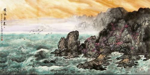 玉田先生山水画的另一个特点是笔墨的清新自然。无论描绘秋山的明净,春山的生机,海疆的辽阔,或抒状风、晴、雨、雪的不同气象,都给人以姿体天真,骨体丰润的新鲜感,例如《紫气东来》、《大宇浩瀚无垠》两图为山海奇景,着意描绘海天初浴晨曦的真切感受。画面上山岚如洗,云蒸霞蔚,惊涛拍岸,白鸥群舞,其皴法依景致运,互为托表,已经看不出传统皴法的痕迹,大有 “不装巧取、皆得天真”的董源之风,但与藏笔于肉的董源笔墨不同,玉田先生的笔墨于肉透骨,见出其华润和奇趣。可见山水画创新的要旨,在于破格,在于师造化、师心源,而不是一味师古。仅以皴法为例,石涛在其画论中总结了五代至明季的皴法近二十种,但他自己的水墨创作也不过采用三、五而已,可见面对强大的传统,端在不因袭、不拘泥、不迷信。诚所谓”法无定法,无法之法乃为至法。”玉田先生的山水作品,实际把各种皴法溶解了,又变化生新,他的山石画法,水之画法,树木之画法是从传统的画法中化解出来,而又吸取了真山真水之气象而创造出来的。创新是为了表现个体的性情以及现实的需要,而这个新恰好是传统皴法与现实生活的结合,是在传统基础上的自然发展。所以新中有旧,旧化为新,这是继承和发展的关系,也是其笔墨清新自然的根本原由。