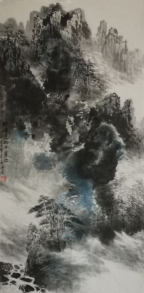 史贵仁先生的山水画,首先震撼我的是画中迸发的气势万丈,溪流潺潺,山势弯延,气象万千,我陶醉在这山水画之中,仿佛自己出置身于画中,史贵仁先生的山水画大气势,是呈现一种水墨淋漓的强烈视觉美感,让人产生翩翩联想,画面折射出一种奇特的艺术张力。只有这样的气势才会让人产生美的认同感,而不会产生美的疲劳。