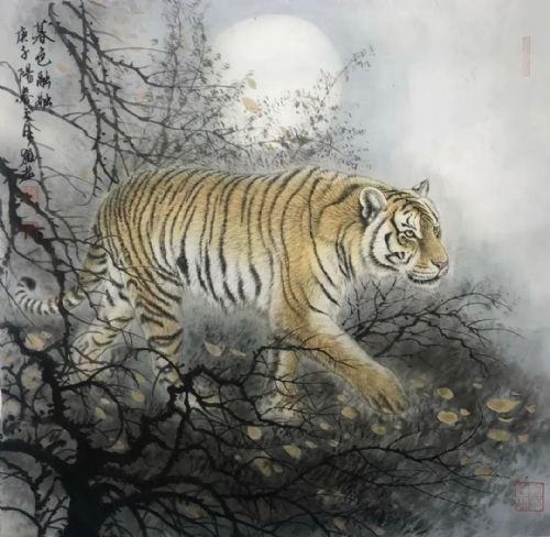 值得一提的是吕维超动物画的背景营造,这也是他富有诗意情趣的画面格调的重要因素。就像《涤魂之地》所表现的那样,白熊在皑皑白雪中闲庭信步,其身上的毛发生长方向带有一种书法线条般的美感,既为了塑造白熊形体服务,同时也是中国画笔墨意趣的体现。更奇妙的是背景中的白雪、冰块,这一背景处理不仅带有较强的体块感和图案性的装饰美感,同时又似乎与立体主义异曲同工,与自然造物既存在明显不同,又能抓住自然事物的精髓,达到心物一体的境界。背景颜色处理按照今天的色彩理解是“黑白灰”,放置于中国古典色彩和绘画美学中,则是“运墨而五色具”。吕维超在许多画作中都运用了这种雪景寒林式的处理方法,比如《快雪时晴》这幅作品,猛虎身处苍老枯劲的草木枝丫之间,背景色彩不多,多为素白,但于纵深和空间感的营造方面仍然是不遗余力的,北方冬日雪后那清幽静谧的气氛也体现得淋漓尽致,氤氲的水墨天空仿佛笼罩着一层雾气,颇有意大利文艺复兴时期威尼斯画派的薄雾质感。吕维超便是这样,他把动物画活了,即便在那些“没有形”的地方——如背景的杂花草木、天空、日月星辰、水汽,画家仍然能达到对“神”的把握,既创作出为大家所喜闻乐见、倍感亲切可爱的动物形象,又能营造冷寂自省的文人气质。