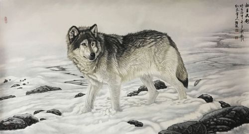 画家吕维超血管里流动的是北方人的血——豪迈而不失谨细,粗犷而不乏温情。他笔下的动物世界也因了画家的性情变得丰富多彩,比如东北虎、狼、熊、猿则被赋予了人的生气与灵智,在与观者交目的一瞬间,令人无由地捕捉到转瞬即逝的顿悟之感,感受其时间与生命的永恒。而画家本人率真坦荡的性格也在画作中体现得一览无遗,他倾情于自然界体系的完整性和法则的严整性,这一特点使其画作具有了绝对的稳定性,从而与转瞬即逝的顿悟感构成心理落差与强烈冲突。画作中空旷辽远的视觉处理,严寒中树木生命的峥嵘之貌以及伸向无际或突兀而起的地平钱,这些都构成了塞北完整的自然空间,也为画中主人的出现营造了一个凄美的诗意舞台。幽幽山涧里传来猛虎的和吼啸,浩瀚苍茫的雪原上现出了群狼的傲骨风姿。在一系列关于狼与虎题材的描绘中,吕维超将对自然物象的整体关照把握得不愠不火,恰倒好处。在寄物抒情的本能意识之外,他将自然界的一切生灵在精神层次上予以深度净化和高度升华,面对自然生命的各种仪态,画家怦然心动,将感情的机缘建构在理性的艺术筑基之上。画家灵动细腻的笔触似乎已经一一浸入了荒寒无垠的茫茫雪野和深不可测的草莽寒林,他的感官世界变得无比细腻和敏感。当夜幕降临,冰冷的月光透过树梢洒在皑皑白雪之上,这时隐约听到由远及近的踏雪之声,世界不再静寂,时空不再凝滞,观者摒住呼吸等待神秘主人的出现。毫无疑问,这又是一个王者纵横的时代。