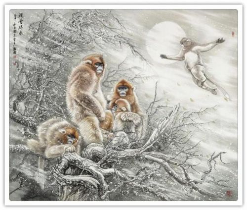 用中国画表达超现实的境界,是“照相机”无法替代的艺术新门类。这种新艺术门类的产生,并非没有源头。如果人们对齐白石的蝉画有印象,那么应该能体验到一代大师齐白石应该有着超现实动物画的启动思想,所以在齐白石的笔下,翼如纯膜,蝉动自然,一只小蝉就是超现实的姿态和意境。只可惜,齐白石画超现实的小蝉虽然有超越的努力,但毕竟他的笔墨被束缚的阻力也过于沉重,所以他画超现实,只能做到“玩悦而已”的地步,无法再施以强大的创新动能,开创超现实动物画的成功空间。