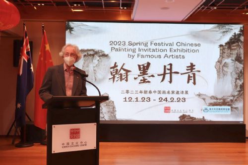 人民网悉尼1月12日电 悉尼中国文化中心和澳大利亚美术家协会共同举办的“翰墨丹青——2023年新春中国画名家邀请展”于11日在悉尼中国文化中心开幕。澳大利亚水彩画协会主席大卫·范·纽恩、澳大利亚美术家协会主席彭伟开、悉尼中国文化中心副主任刘东、参展艺术家、澳各界人士代表约100人出席了开幕式。