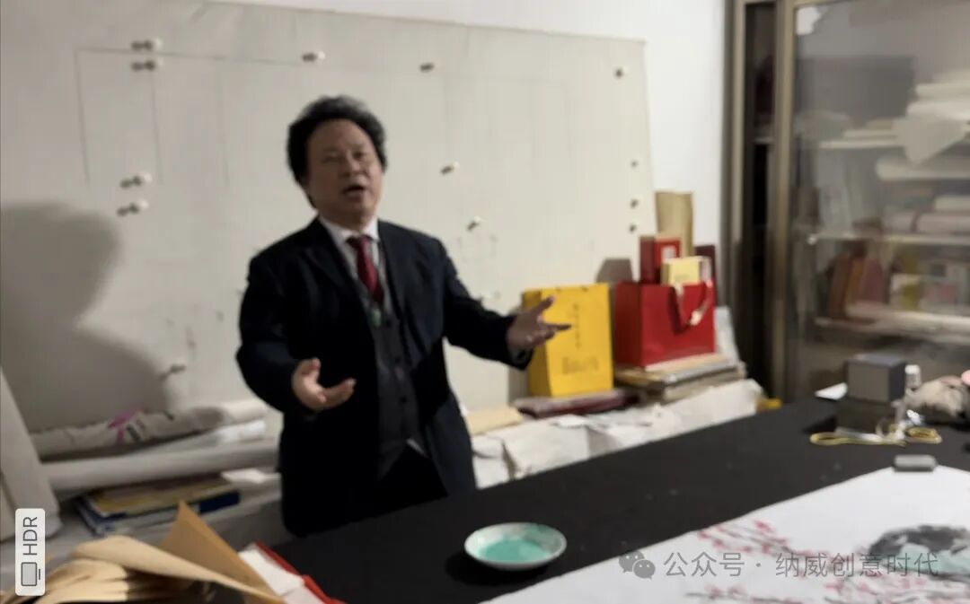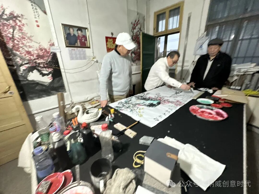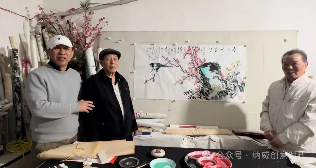 梅园之中,梅花尚未凋零,仍透着傲然的风骨。映照着三位艺术家专注的身影。执笔、调墨、落纸,笔锋游走间,天地万象在宣纸上徐徐展开。云烟流动,桃红竹翠,皆跃然纸上。这不仅是技艺的交流,更是精神的共鸣,一种对自然、艺术与生命的感悟。