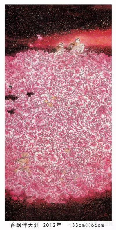 他的工笔花鸟大体有两种面貌:一种是满而密,我称之为密体花鸟。如《历尽沧桑拥春风》《独恋春芳乐忘归》《天涯无处不芬芳》《空巢》《千里外风月何夕》《昔日重来》《绿梦》《蛙鸣吟入夜》《新月》等作品,表现内容很宽泛,或为广阔田野中的花如海洋,或为盘根错节的老树古杈,或为秋去冬来的农家院落,或为密集风长的野生灌木,其中有鸟雀的缠绵,也有家禽的安详,还有与乡村生活相关的花草杂物写照。所谓“满”,就是基于这些繁茂野奇的自然景物而形成的构图特征,直呈大自然生命本质的一角;而“密”则是突破传统花鸟那种疏朗单薄的层次,追求画面整体的丰富多彩,更多的是画家实境的感受。另一种是空而疏,我称之为疏体花鸟。如《芬芳惹人醉》《风雪傲红颜》《红岁月》《红花红系列》《永远到底有多远系列》《不入九天但知云高》《秋思》《芬芳之吻》《远方可有红花香》等作品,多为空灵的布局,主体以中景为主,或上空下密,或右空左密,或上空下虚中间密,突出其一丛花、一对鸟的花情鸟态,变显现空间为想象空间,又以西方平面构成为参照,追求着富有象征意味和心理时空的花鸟意象。平面构成是西方的一种设计意识,着重于几个造型单元组成一个整体的法则,讲求把物象抽象为几何形体作为秩序的排列,其主旨是把自然形态抽象为艺术形态,把自然空间幻化为艺术空间,体现了美在关系中的法则。王云正是以这种构成的眼光结构他的疏体花鸟,虚灵中见花团锦簇,繁密中见天地宽广,带有更多的主观色彩。他的创造性是在这些大虚大实、大疏大密的意象性的符号中,强调画面形式感的纯粹,注重工而有意的情感抒发,可谓现代工笔花鸟提升自然美的一个创举。