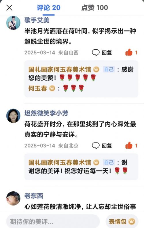 从评论区的专业视角看,何玉春的艺术魅力体现在三个维度:其一,技法之妙——“细腻入微的层次感”(《胡琼》评)与“恰到好处的色彩搭配”(《得就德》评),展现了扎实的传统功底;其二,意境之深——“每一笔都彰显艺术魅力”(《super@雪》评),在“写意”中融入诗性,让画面“如散发淡淡香气般吸引眼球”(《hhf》评);其三,精神之核——以荷花为载体,传递“心如莲花”的纯净力量,正如“老东西”所言,让人“忘却尘世俗事”,在艺术中找到心灵的栖息地。